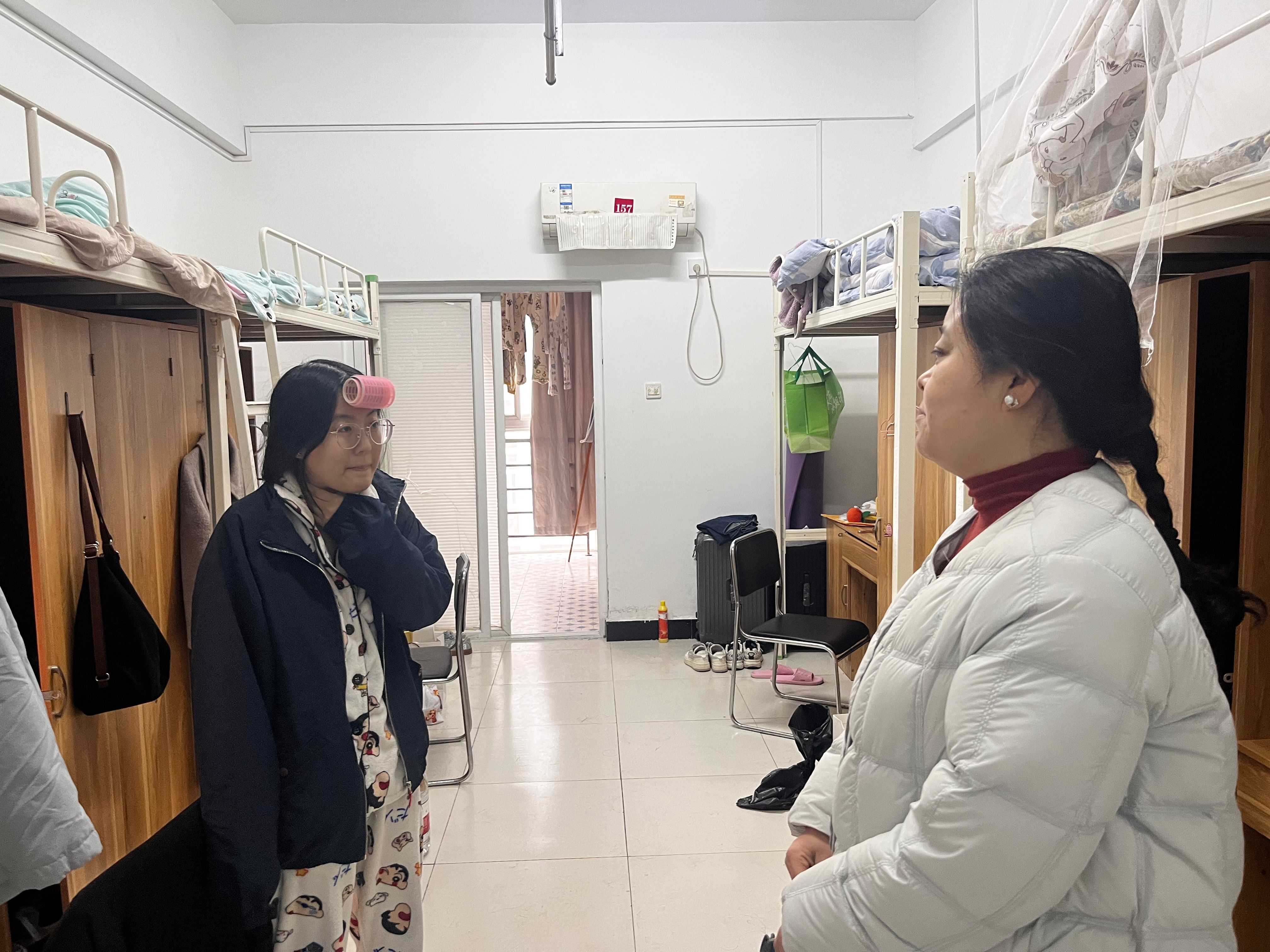 12月4日,湖北汽车工业学院武汉产学研基地副书记薛建云深入学生寝室,走访慰问大四学生,关心了解他们在就业、备考及职业规划方面的具体情况。薛建云与学生亲切交流,耐心解答疑惑,并鼓励大家坚定信心、积极应对挑战,充分利用学校资源提升综合能力。